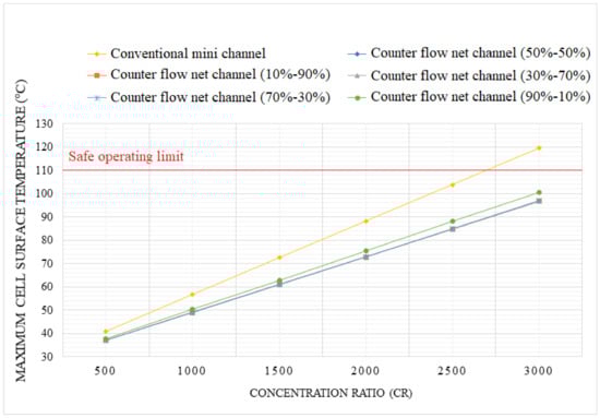 The variation of the maximum solar cell temperature at a constant mass flow rate of / with different concentration ratios ranging from 500× to 3000× is shown in Figure 14. The maximum cell surface temperature for the conventional channel rises to at a concentration ratio of 3000×, which is higher than the safe operating limit of the solar cell, (110 ). The counter flow net channel had the lowest cell surface temperature with equal flow rates in both layers, and the reduction in maximum cell surface temperature was significant, ranging from to when compared to the conventional channel at concentration ratios of 2000× and 3000×, respectively. Furthermore, the surface temperature was kept below the recommended limit, with maximum temperatures reaching and at concentration ratios of 2000× and 3000×, respectively. Under the same test conditions, the surface maximum temperature was almost the same for the other shared mass flow fractions between the two layers, with the exception of the case 90–10% flow rate.
