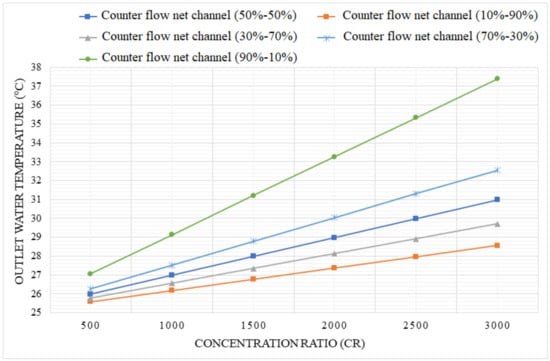In the case of a counter flow net channel based-heat sink design, the average outlet water temperature is very low when compared to the conventional mini channel, because the water in the upper layer of the heat sink reaches its maximum temperature in the mid-path just below the triple-junction solar cell, where the hot water has been in thermal contact with the entering cold water in the second layer at the last part of the first layer. The variation of the outlet water temperature with a constant mass flow rate of / and various concentration ratios ranging between 500× and 3000× for the counter flow net channel configurations is shown in Figure 16. The highest outlet water temperature was recorded by a counter flow net channel configuration with a flow rate of 90% and 10% in the upper and lower layers, respectively, as shown in the Figure 16. The outlet water temperature for this configuration reached up to and for concentration ratios of 2000× and 3000×, respectively. Furthermore, raising the concentration ratio showed a significant influence on increasing the exit water temperature for all configurations.