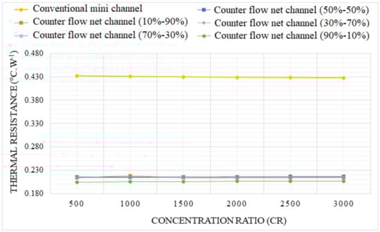 The thermal resistance of the counter flow net channel configurations against various concentration ratios and a constant flow rate of 0.001 kg/s is shown in Figure 17. According to the data, the lowest thermal resistance was observed by using a counter flow net channel configuration with a flow rate of 90% in the upper layer and 10% in the lower layer to be /, whereas the maximum thermal resistance was observed by the conventional mini channel and reached up to / at the same mass low rate. As a result, higher flow rates should be used for the upper layer to enable more heat movement over it since it has lower thermal resistance than lower mass flow rates. It is also worth noting that since the heat capacity of water is high, the moderated reduction in thermal resistance with increasing the channel layers did not yield significant increase in the outlet temperatures.