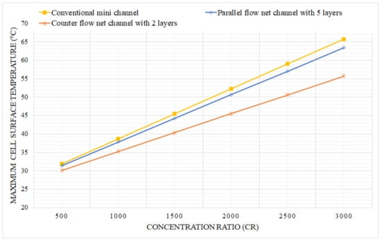 The variation in maximum cell surface temperature for the three channel heat sink designs is shown in Figure 18, at concentration ratios ranging from 500× to 3000×. In these simulations, the convective heat transfer coefficient of the air is dependent on the characteristic lengths, sketch, and roughness of the external boundaries of the geometry design and also on the hydrodynamic characteristics of the wind flow. The figure shows that at the maximum concentration ratio of 3000×, the maximum cell surface temperature is minimum for the counter flow net channel heat sink, with a reduction of 11.72% and 12.01% compared to the parallel flow net channel and conventional mini channel, respectively. For the counter flow net channel, the maximum cell temperature does not exceed at a concentration ratio of 3000×.