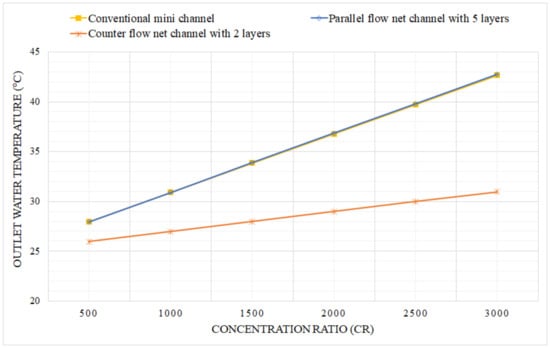 The variation in outlet water temperature is shown in Figure 19. The outlet water temperature is lowest for the counter flow net channel among the selected heat sink designs. This is because in a counter flow configuration, hot water exiting via the lower layer of the heat sink transfers heat to cold water entering through the top layer. When compared to the counter-flow net channel, the conventional and parallel flow net channels have 27.36% and 27.55% higher outlet temperatures, respectively, which makes the conventional channel or net channel superior if possible uses such as desalination are prioritized with the thermal energy recovered from the HCPV system.
