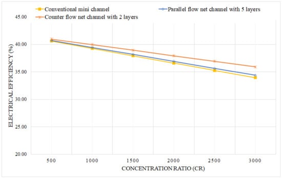 To analyze the electrical performance of the HCPV module, the electrical efficiency is calculated for the module integrated with all the three heat sink designs and plotted for different concentration ratios as shown in Figure 20. At a water mass flow rate of /, the HCPV module with the counter-flow double-layered net channel heat sink offers the highest electrical efficiency at all concentration ratios. The difference is considerable at higher concentration ratios, with an increase of 4.42% and 5.83% compared to the parallel flow net channel and conventional channel designs, respectively, at 3000×.