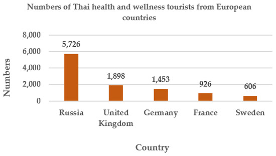 The European health and wellness tourists were mainly from Russia, followed by the United Kingdom, Germany, France, and Sweden, as shown in Figure 2.