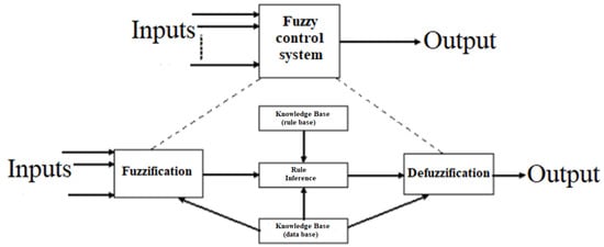 A fuzzy control system is a mathematical system that assesses analog input values in terms of logical variables that take on continuous values between 0 and 1, as opposed to classical or digital logic, which operates on discrete values of either 1 or 0 (true or false, respectively). Fuzzy control systems are less expensive to develop and cover a broader range of operating scenarios, making them suitable for diagnosing gearbox and motor problems. Fuzzy If–Then rules are commonly used to characterize the conditional statements that make up a fuzzy control system [20,23]. Four components make up a sophisticated fuzzy control system; these are fuzzification, defuzzification, knowledge base and inference engine. Figure 1 depicts the four components that make up a sophisticated fuzzy control system [23,24].
