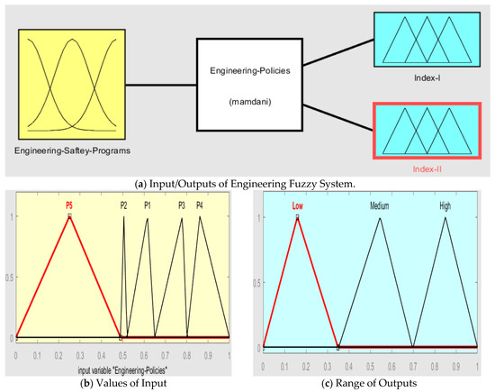 A fuzzy system was designed for the engineering safety program to determine the effect of that program on road safety policies. The engineering safety program fuzzy system with one input and two outputs is presented in Figure 3a; the inputs are presented in Figure 3b with different values (P1, P2, P3, P4, and P5). The two outputs were Index I (Fuzzy) and Index II (Fuzzy) with three ranges (low, medium and high), as presented in Figure 3c.