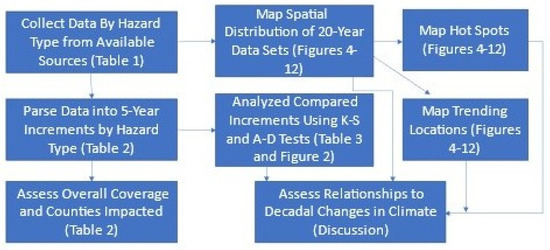 Overall Approach: The methodology used to conduct these analyses examining changes in frequency, intensity, and spatial location is summarized in Figure 1 and described in detail below. The figure targets collecting data regarding natural hazards, parsing the data into analytical units, testing frequency changes, assessing spatial attributes (hot spots, trending locations), and accumulating evidence of climate change relationships.