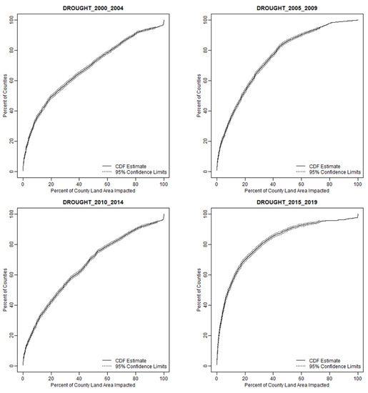 Example of cumulative distribution function (CDF) for drought in 5-year increments (excludes counties with no drought).
