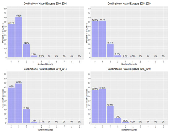 Another approach for examining frequencies of events is to assess the number of different types of natural hazards that affect a single county during the five-year increments. The number of different natural hazard events experienced by a county during each of the time periods shows a 51% increase in the percent of counties experiencing two or more natural hazards from 2000–2004 (16.8%) to 2015–2019 (25.3%) (Figure 3). Counties experiencing no natural hazards ranged from 37–41%, while those encountering only one hazard ranged from a low of 38% in time period four (2015–2019) to a high of 46% in time period one (2000–2004) (i.e., 18% decrease). The number of counties encountering four or more natural hazards during a time period increased seven-fold.
