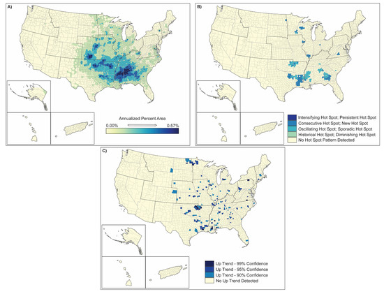 Spatial analysis results for landslides (2000–2018) showing (A) inverse-distance model of percent area impacts of landslides, (B) emerging hot spot analysis by hot spot type, and (C) counties demonstrating upward trends in percent area by confidence level.