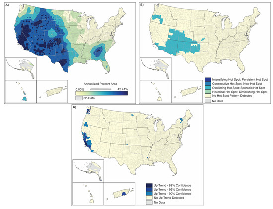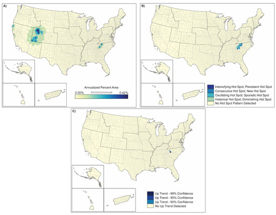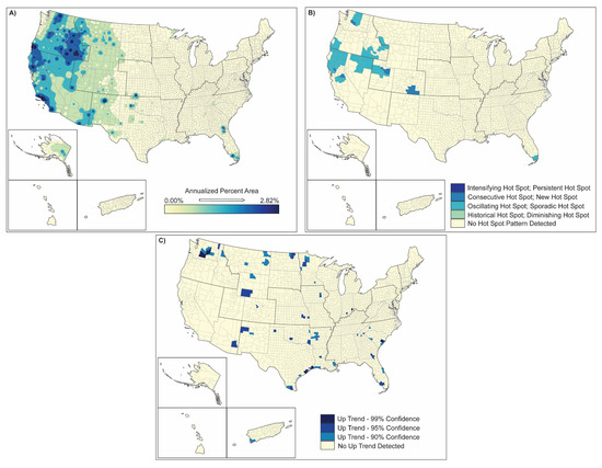 Spatial analysis results for wildfires (2000–2019) showing (A) inverse-distance model of percent area impacts of wildfires, (B) emerging hot spot analysis by hot spot type, and (C) counties demonstrating upward trends in percent area by confidence level.