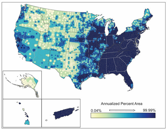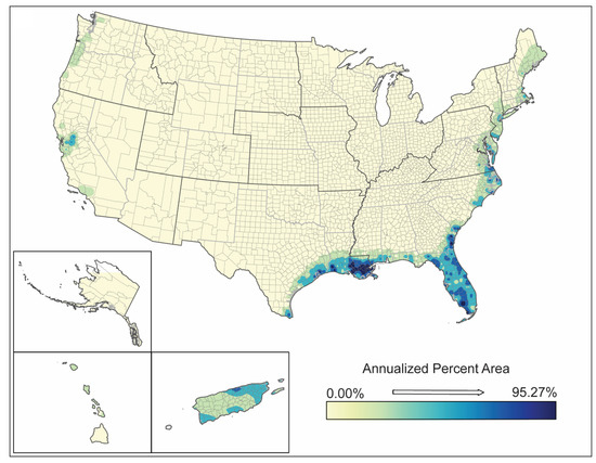 No hot spot or trend analyses could be completed for flooding (inland or coastal) or earthquakes due to data only being available for the period 2015–2019. Even with a relative paucity of information (compared to other natural hazards), coastal flooding occurs in about 11% of US counties (345 counties) which corresponds to nearly all coastal counties along the east coast and Gulf of Mexico coast. About 60% of those counties are impacted across 100% of their land areas (Table 2 and Table 3). Similarly, 2998 counties (93% of US counties) are most likely exposed to some inland flooding impacting <26% of the area for 20% of the counties. (Table 2 and Table 3). Coastal flooding is particularly impactful in areas of south Louisiana, southern Florida, northeastern coastal Texas, and Puerto Rico (Figure 8). Unlike coastal flooding, which is restricted to eastern and southern coastlines, inland flooding most likely heavily impacts almost all of the United States east of the Mississippi River and all of Puerto Rico. Additional areas heavily impacted include southern Minnesota, southern Michigan, eastern Iowa, northern Missouri, south-central Texas, southwestern Louisiana, and selected Hawaiian Islands (Figure 9).