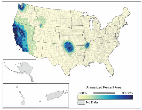 With similar data availability, analyses of annualized percentage of the area impacted by earthquakes were restricted to the 2015–2019 time period. Earthquakes were observed in 681 counties (7%), with impacted areas in 60% of these counties of ≤99% of their land areas (Table 2 and Table 3). Earthquakes are concentrated primarily in four areas of the US—California and western Nevada, the Puget Sound region of Washington, central Oklahoma and south-central Kansas, and the four corners area of Missouri/Kentucky/Tennessee/Arkansas (Figure 10). Lower impacted areas exist throughout western Arizona, eastern Nevada, southern Oregon, eastern Idaho, southwestern Montana, and western Wyoming.