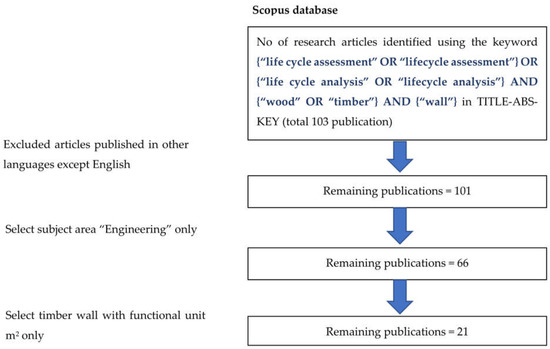 Step (2): Database search. The purpose of the study was to assess a representative sample of peer-reviewed articles to examine the environmental implications of wooden walls. Scopus is a database that allows for the discovery of peer-reviewed scientific articles. There are a total of 1588 peer-reviewed articles on this database that include the terms “life cycle assessment”, “life cycle analysis”, and “timber or wood”, as of Aug 2021. Following a reference to another keyword, “wall”, 103 publications were categorized (Figure 2).