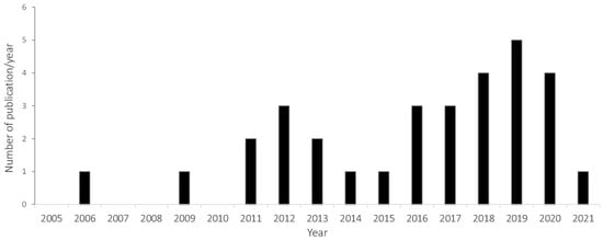 Histogram of the reviewed published articles regarding timber walls.