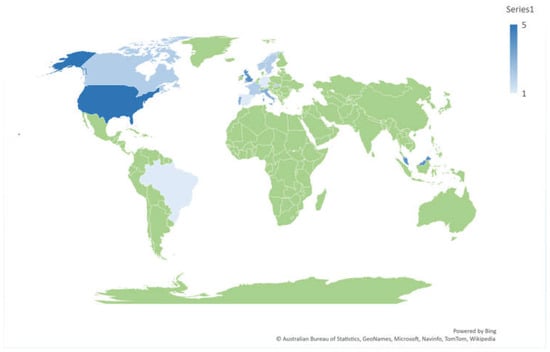 In Figure 3, the blue color bar indicates the number of articles published in that country. Number 1 (light blue) shows the lowest number of (one) articles published, and number 5 (deep blue) indicates the highest (five) number articles published.
