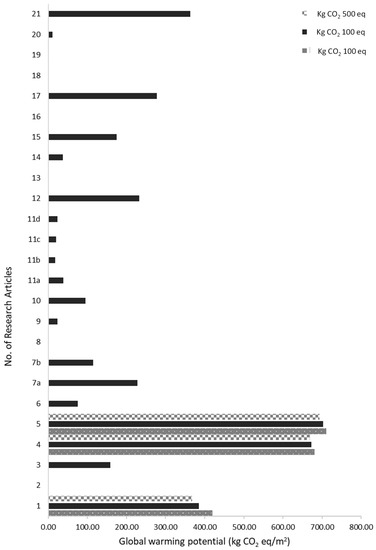 Some researchers further studied composite walls such as the concrete glulam framed panel (CGFP). They analyzed and calculated the greenhouse gas emissions and embodied energy of that composite wall and concluded that the panel had more negligible environmental impacts (60.63 kg CO2 eq./m2) than a similar study (363 kg CO2 eq./m2) [63]. The functional unit plays a significant role in the life cycle assessment study. The carbon emission (60.63 kg CO2 eq./m2) of that study was related to a 1 m2 wall, whereas, in the supporting study, carbon emission (363 kg CO2 eq./m2) was related to 1 m2 of floor [16].