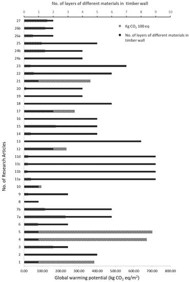 The primary vertical axis represents the number of research articles. The primary horizontal axis represents the global warming potential reported in these articles, and the secondary horizontal axis represents the number of layers of timber frame materials.