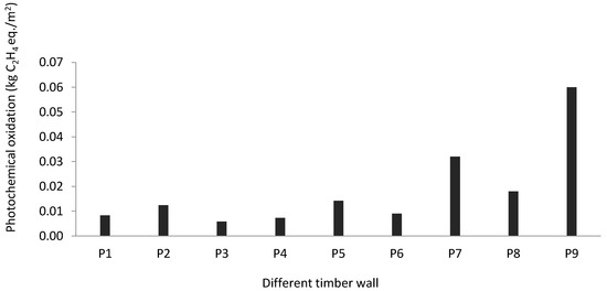 Some researchers assessed timber walls (P6, P7) with cradle-to-gate system boundaries [29,59]. The results indicated that P6 timber wall was less (0.009 kg C2H4 eq./m2) responsible for photochemical oxidation formation than P7 (0.032 kg C2H4 eq./m2). P8 timber wall was also responsible for high emission (0.018 kg C2H4 eq./m2) because of additional timber elements such as OSB, MDF and others [40]. Photochemical oxidation impact was considerably high for the P9 timber wall (wood frames with extruded polystyrene) compared to the other timber walls. Researchers considered every phase, such as construction (material production and transportation) and use phase (maintenance, heating, and cooling processes) for the environmental impact assessment. All these activities impact the environment, and the environmental impact of other timber walls could be high if the researchers considered the construction and use phases.