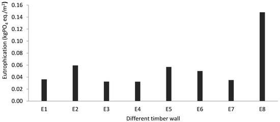 During wood production, fertilizer is used for all timber walls, which is responsible for eutrophication. In addition, formaldehyde-based compounds are used as a binder that impacts acidification [38]. During the use phase, heating and electricity production release a significant amount of nitrate and ammonia, responsible for marine eutrophication [53]. Researchers analyzed the impact of the wood frame with extruded polystyrene for each significant building phase, including construction, material production, transportation, maintenance, and use phase (Table 7). So, Figure 7 indicates that the eutrophication impact was significantly high for the timber wall with extruded polystyrene (0.148 kgPO4 eq./m2) [3]. In addition, the end-of-life phase, the landfill of timber, and insulation also have a negative impact on eutrophication. Other timber materials have a relatively lesser (0.016–0.059 kgPO4 eq./m2) impact on the environment, due to cradle-to-gate system boundary limitations [29,38,39,40].