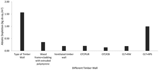 Additionally, transportation is an integral part of every phase which requires fossil fuel. During the end-of-life stage, incineration has the most impact on abiotic depletion. Figure 8 shows a wooden frame with extruded polystyrene, ventilated wooden wall, cross-insulated timber, and cross-laminated timber [3,38,40]. The cross-insulated timber and cross-laminated timber used different insulation, and ICB insulation required more abiotic resources than ICB, RW, PUR, and XPS [38]. The ventilated timber wall consisted of OSB, MDF, wooden sheet and fibers responsible for abiotic depletion [40]. The project life for a wooden frame with extruded polystyrene material is 50 years. Its environmental impact has been assessed for different life cycle stages such as manufacture, construction, use, and maintenance. All stages impose an additional impact on that material, whereas only material manufacture and the end-of-life stage are considered for impact analysis for cross-insulated timber and cross-laminated timber. As the use phase of a building requires a significant amount of fossil fuel to generate energy and heat, this phase greatly impacts the environment. If the researchers include the use phase for cross-insulated timber and cross-laminated timber, the environmental impact could be significantly higher for those timber walls. At present, abiotic depletion for timber walls with extruded polystyrene is significantly high (1.65 kg Sb eq./m2), compared to other walls (0.0134–0.99 kg Sb eq./m2).
