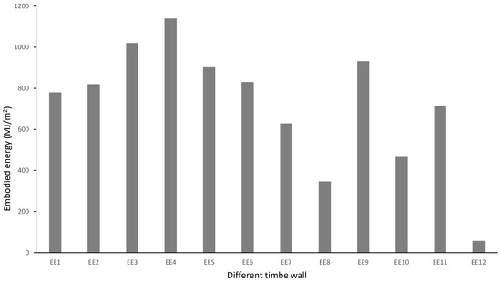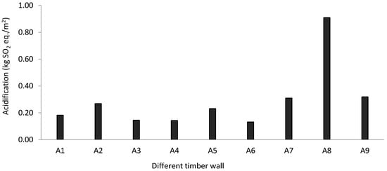 Table 8 is the list of timber wall elements. Wood frames and cladding with extruded polystyrene have been assessed for a fifty-year lifetime, impacting the manufacturing, construction, transportation, maintenance, and use phases. Acidification impact for this timber wall is 0.91 kgSO2 eq./m2 [3]. In comparison, other exterior timber walls have less impact (0.132–0.31 kgSO2 eq./m2), as those materials have no impact on the use and maintenance phase (Figure 9) [9,38,40]. The acidification impact for interior wall is 0.17 kgSO2 eq./m2, which is comparatively less, although it was assessed by the cradle-to-grave system boundary [10]. The impact is low because no insulation has been used in that interior wall.