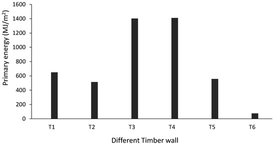Table 9 shows that T1 and T2 are similar materials (2 × 4 untreated wood stud with fiberglass batt insulation). However, T1 material was assessed with the hybrid LCA technique while T2 was assessed by process-based LCA [9]. Process-based LCA is a bottom-up LCI approach that uses industrial process-based LCI data within a product’s life cycle. In contrast, hybrid LCA is the combination of an input–output model and process-based LCA. A hybrid approach was applied to extract and manufacture wood frames and process-based LCA for the remaining phase. Primary energy use depends on the system boundary. As the hybrid approach includes an input–output model also, this additional activity requires more primary energy.
