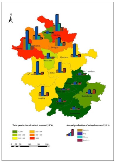 - Zhang, J.Y.; Wang, B.W.; Yyan, X.J. Spatial and temporal distribution features of livestock and poultry manure and nutrient content in Anhui Province. J. Agric. Resourc. Environ. 2021, 38, 295–304. [Google Scholar]