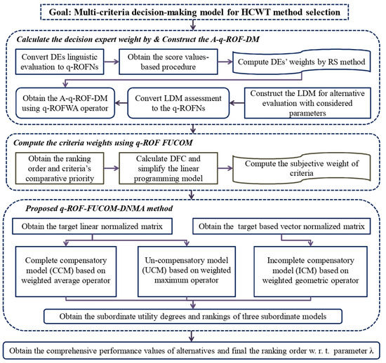 Corresponding to the extant literature on the HCWT management in MCDM, a few authors have studied this application with q-ROF-DNMA. To date, there are no studies on q-ROF-FUCOM-DNMA. To fill this research gap, we developed the q-ROF-FUCOM-DNMA methodology. This presented weighting procedure and ranking approach give the chance to elucidate DE’s hesitation and ambiguity when they are providing the values for choosing the suitable option. Furthermore, the application of HCWT method selection has a lot of hesitant and vague terms, as well as some vague attributes. When DEs provide the degrees for attributes, they want to illustrate their views of hesitation and ambiguity, and the q-ROFSs assist to assign the BDs in terms of q-ROFNs. Hence, application of HCWT with q-ROFNs is considered the key motivation of this study.