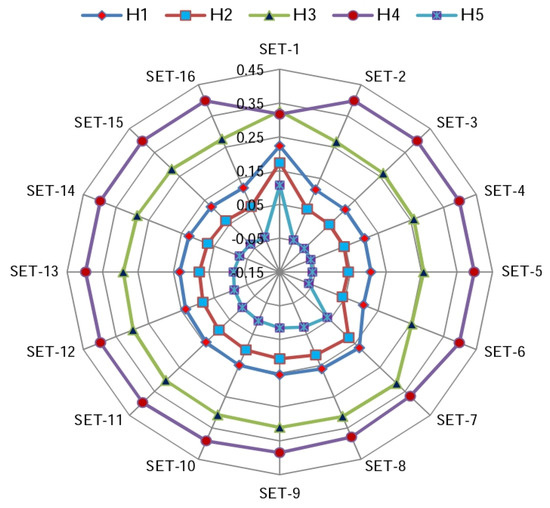 The S.D. and adjusted weight coefficient of criteria are determined by Equations (13) and (14) as follows: