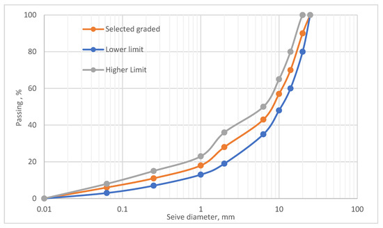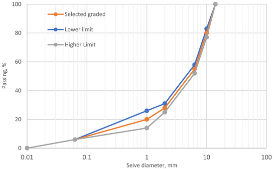 Figure 1 and Figure 2 show the particle size distributions of these gradations. The physical properties are given in Table 1. The different mixes of CBEMs with two types of filler (OPC with limestone or OPC with CKD) are illustrated in Table 2. The total percentage of filler used was 6% of the total aggregate weight. The bitumen binder 50–70 (CB3-50) was used to prepare the cold mix asphalt. The comparison between the cold mix asphalt and the hard hot mix asphalt, as well as the soft hot mix asphalt, was conducted using bituminous binder 61 and 143 pen grades. The properties of both the bituminous emulsion and the bitumen binder used in this study are shown in Table 3. The cold mix asphalt and hot mix asphalt specimens were mixed and compacted at laboratory temperatures of 20–25 °C and 160–170 °C, respectively.