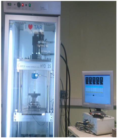 ITSM is a non-destructive test that determines the stiffness modulus of bituminous mixes, both hot and cold. The test was conducted following BS EN 12697-26 [30]. A steel load frame, a load cell with a pneumatic load actuator, a deformation measurement system, and a personal computer that records the electrical signals from the load actuator on five monitors make up the majority of the test equipment. Figure 3 depicts the test equipment within the refrigerated incubator, as well as the test specimen mounted on the loading platens and connected to the computer that measures deformation. The experiments were carried out at a constant temperature of 20 degrees Celsius. Table 5 depicts the test circumstances. The HYD 25 device from Cooper Research Technology was used to test ITSM for various specimens.