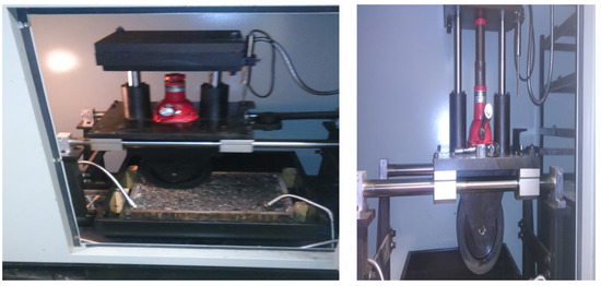 Permanent deformation, mainly referring to rutting, is one of the main distress modes of asphalt pavement [34,35]. The deformation expected to occur in asphaltic materials under wheel loading is predicted using an autonomous wheel-tracking tester (HYCZ-5). The wheel-tracking equipment is shown in Figure 5. A Cooper roller compactor was used to make the slabs. The slab was 400 × 305 × 50 mm in size. Table 7 depicts the test circumstances. The test was carried out at various temperatures, including 20, 45, and 60 degrees Celsius, to evaluate the materials under various weather situations. The rut depth under load was measured in relation to the wheel load. Resistance to rutting at different temperatures was determined in accordance with BS EN 12697-22 [36].