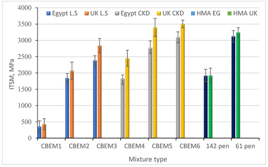 This difference might be due to the stiffness of the said mixes, which depends on the strength of the secondary binder, so these results agree with the results presented in Figure 7. Both the CBEM UK6 and CBEM Eg6 mixes (80% OPC with 20% CKD) had a higher ITSM in comparison to both HMAs.