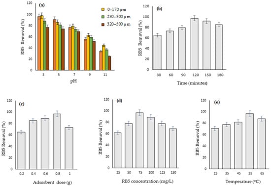 Reactive Black 5 adsorption was assessed by three types of BPB particle sizes such as 0–170, 230–300, and 320–500 µm. As the BPB size reduces, adsorption of RB5 molecules increases, because of the enlarged surface area of small particles, hence the surface area of BPB was directly proportional to RB5 absorption (Figure 3a). For large-sized particles, diffusion resistance to mass transport is high and internal surface cannot be used for adsorption and due to this, less dye amount was adsorbed.