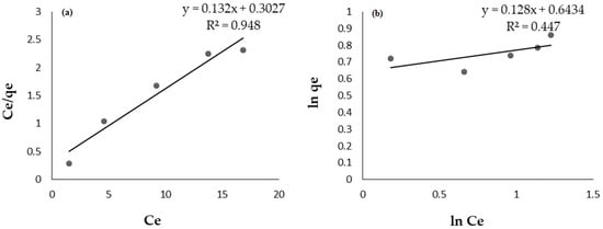 (a). Langmuir isotherm for RB5 dye adsorption by BPB (b). Freundlich isotherm for RB5 dye adsorption by BPB.