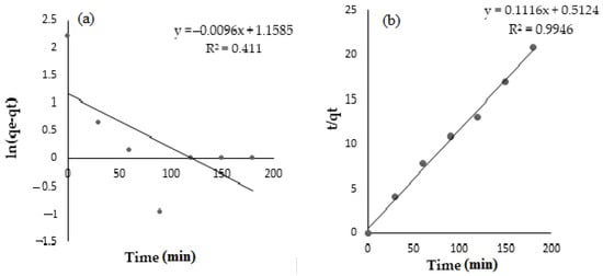 (a) Pseudo-first order model and (b) Pseudo-second order model for RB5 dye adsorption by BPB.