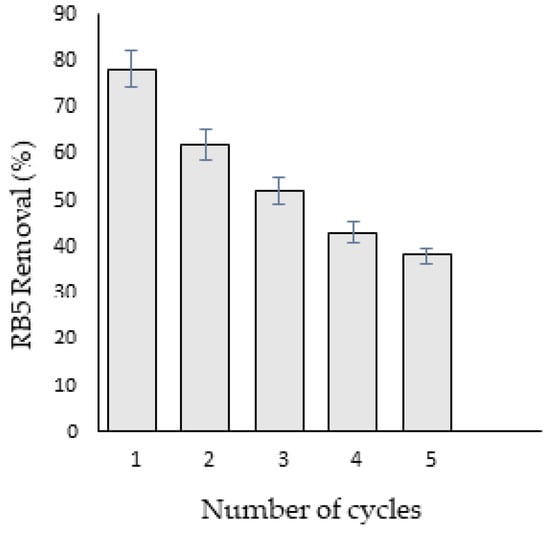 Recyclability of BPB is an important parameter for the evaluation of total expenditure of the adsorption process which inhibits secondary pollution. Regeneration a is key indicator for the evaluation of the performance of an adsorbent. The regeneration process requires proper selection of eluent and it depends on the type of adsorbent and adsorption mechanism. Reactive Black 5 dye solution contains both positive and negative functional groups so both basic and acidic media are required to desorb dyes from the biochar surface. In an acidic medium, the solution consists of H+ that attaches with the dye molecules with negative functional groups and desorbs from the adsorbent surface. Similarly, in basic medium, the dye molecules containing positive functional groups were removed [68]. Therefore, in the present analysis for obtaining maximum recovery, BPB was washed first with 1N HCl after that, the same biochar was washed with 1N NaOH. However, with the progression in the number of cycles, the efficacy of the dye removal reduced, which might be due to the blockage of the adsorption sites present in the micropores. For the regeneration analysis, 75 mg/L RB5 dye solution was used with 0.8 g banana peel biochar; as in batch experiments maximum 97% RB5 dye removal was observed with 75 mg/Ladsorbate concentration and 0.8 g BPB. Reproduced biochar exhibited 78, 62, 52, 43, and 38% RB5 dye adsorption efficiency from the first to fifth cycle (Figure 6). Hence, regenerated banana peel biochars can be reutilized for the uptake of RB5 dye.