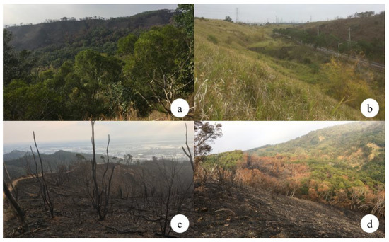 (a) Acacia forest; (b) Panicum maximum grassland; (c) burnt trees; (d) fire disturbance in Dadu Terrace of Taiwan.