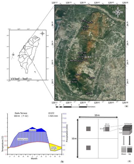 Dadu Terrace in Taiwan is located on the west side of Taichung Basin, bordered by Dajia River in the north and Dadu River in the south, with a length of approximately 20 km from north to south, a width of approximately 7 km from east to west (Figure 2a), and a maximum elevation of 310 m. Its geology is part of the Toukoshan formation, and the soil is mainly red clay with poor water retention and contains a lot of gravel [27,28]. The climate of Dadu Terrace is characterized by distinct wet and dry seasons. The climate diagram (Figure 2b) shows that the dry period lasts from October to January of the upcoming year and the per-humid period lasts from March to September. The forest area has gradually reduced in recent years owing to land development and fire disturbance [29]. The composition of the existing vegetation can be divided into forest and grassland based on the vegetation physiognomy, and the latter is dominated by the invasive plant P. maximum. One of the dominant species that form the forest is A. confusa, one of the essential afforestation species in Taiwan, and it has the largest area of the broadleaf plantation at low elevation [30]. In addition, there are many cemeteries in the area. After entering dry autumn and winter seasons, the aboveground Panicum maximum accumulates flammable fuels [31], which are often accidentally lit by human activities. The frequent fire disturbance has caused a reduction in the forest area of Dadu Terrace [29,32] (Figure 1c,d), resulting in a retrogressive succession of vegetation. As the deforested area expands and the surrounding forest vegetation becomes remote and fragmented, forest recovery becomes less resilient, resulting in slow or even stagnant succession.