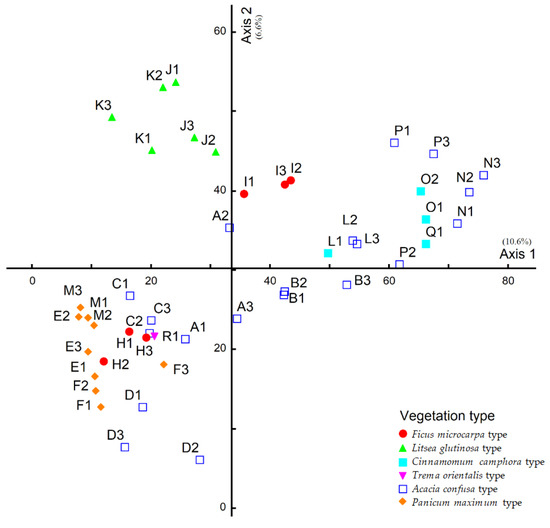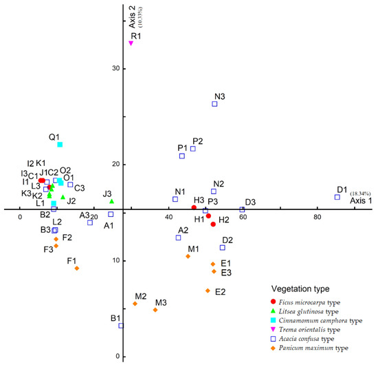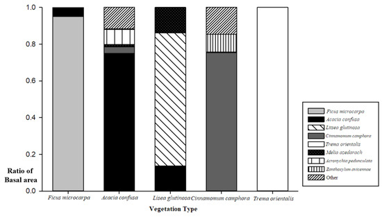 A total of 37 forest plant communities were sampled, cluster analysis was conducted based on the IV of tree species of the sampling plot, and a dendrogram was drawn (Figure 3). According to the vegetation physiognomy, the plant community was divided into forest and grassland. The plots of forest plant communities were classified into five types with information maintenance of 40% as the threshold value. Furthermore, the most dominant species in the basal area of the overstory were used as the names of the vegetation types (Figure 4), including Ficus microcarpa type (six sample plots), Acacia confusa type (two-sample plots), Litsea glutinosa type (six sample plots), Cinnamomum camphora type (four sample plots), and Trema orientalis type (one sample plot).