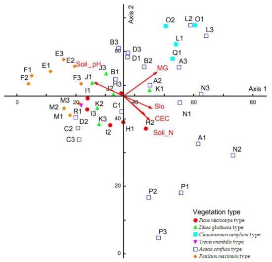 Canonical correlation analysis (CCA) of understory vegetation in Dadu Terrace, Taiwan. CEC: cation exchange capacity of soil; MG: moisture gradient; Slo: slope; Soil_N: soil total nitrogen; Soil_pH: soil pH.