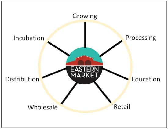 An innovative business model: The economic platform of the Eastern Market is rather unconventional. It is managed by a nonprofit organization, the Eastern Market Partnership, which is a public–private collaboration between the city and local businesses. While it primarily coordinates rental or leasing spaces at the market, its success largely depends on the positive, long-term relationships between farmers, merchants, and customers. A former Eastern Market program coordinator, Fiona Ruddy, described the Eastern Market as a hub that connects vital community spokes, ranging from growing, processing, education, retail, wholesale, distribution, and incubation (see Figure 1, [111]). The stronger these ties, and the more integrated and successful the communities that develop within and around the market, the more prosperous and institutionalized the market becomes. In a sense, this is an unusual example of stakeholder capitalism [112,113], where the core institution is a nonprofit organization that primarily fosters the economic and socioeconomic interests of its for-profit business partners. The core business model emphasizes a strategic and adaptive development of local and regional partners and partnerships.