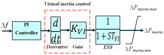 The modelling of a virtual inertia control block can provide the necessary inertia power to a microgrid to compensate the lack in system inertia because of the high integration of RESs, as shown in Figure 2. In this work, the proposed virtual inertia control consisted of a derivative element, ESS, virtual inertia gain, and a power limiter, as indicated in Figure 3. One of the most significant components in virtual inertia control is the derivative control element, as it calculates the RCF to provide the necessary compensated inertia power to the microgrid through ESS and power inverters during high penetration of RESs and disturbances [22,30]. The RCF can be calculated as follows: