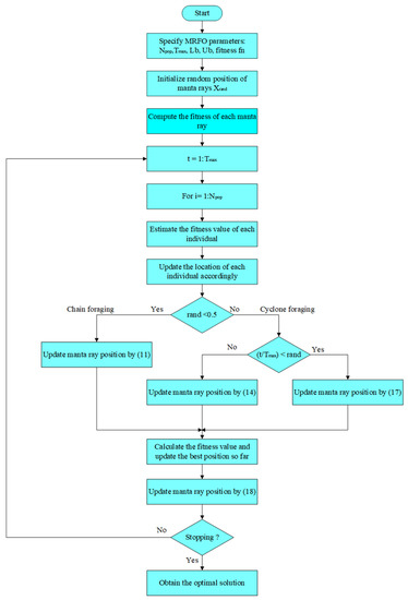 where and are random values between 0 and 1, S is the somersault coefficient for determining the somersault range. Equation (18) shows that each manta ray is able to reach any location among the current location and symmetrical locations in relation to the pivot in the searching area. Thus, the distance is reduced between the individual location and the best location found moment by moment through this strategy. Therefore, each individual moves regularly to the optimum location in the searching area. Moreover, the somersault coefficient for determining the somersault range decreases as iterations increase. Figure 4 shows the flowchart that describes the operation of MRFO [41]. The exploration and exploitation behavior are controlled by the MRFO by controlling (). When () > rand, the exploration behavior is performed; when () < rand, the exploitation process is performed, and the individual in the optimal position is used as a reference. A random number is also used to select between chain or cyclone foraging. Then, somersault foraging is performed.