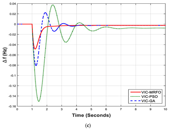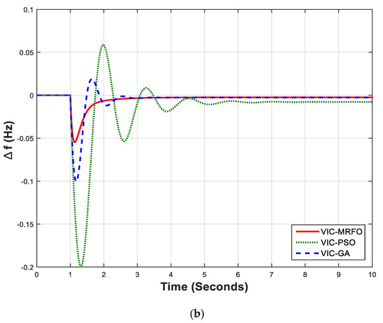 In this scenario, the studied microgrid was subjected to step load changes of 5% and 10% in case of a 50% reduction in microgrid overall inertia (i.e., uncertainty). The studied microgrid performance was investigated under load disturbances and system uncertainties (i.e., low system inertia). Figure 6a,b indicates the frequency deviation of the microgrid under 5% and 10% step increases in load under a 50% reduction in system inertia. It can be seen that there were high fluctuations in the microgrid frequency and large frequency deviations in the case of low microgrid inertia. Table 4 shows that a more satisfactory result was obtained by an MRFO-based PI controller with a virtual inertia controller dealing with disturbance alleviation and frequency reference tracking quality and minimizing steady-state error during low microgrid inertia conditions. The simulation results indicated that the MRFO-based PI controller was better in tracking the microgrid frequency reference point during a sudden load power increase compared with PSO-based and GA-based PI controllers in the virtual inertia control loop.