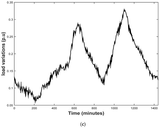Power variations: (a) wind power, (b) solar power, (c) load.