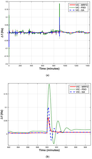 The system frequency response was investigated under nominal microgrid inertia. Figure 8a shows that the microgrid frequency response was affected by RESs penetration and load power fluctuations. For a clear comparison between the MRFO-based PI controller and other optimization algorithm-based PI controllers in the virtual inertia control loop, Figure 8b shows a zoom view of the microgrid frequency response at time = 900 min when the load was disconnected. This can be considered a complete load shedding case in the islanded microgrid to test the system response under severe operating conditions. The evaluation parameters of the studied microgrid frequency deviation with different control techniques were compared and are presented in Table 6. It can be noted that the PSO-based PI controller was able to regulate the frequency within 0.2 Hz, and the GA based-PI controller was able to regulate the frequency within ±0.1 Hz. On the other hand, the MRFO-PI controller-based controller was able to regulate the frequency within ±0.06 Hz. Therefore, the MRFO-PI controller in the virtual inertia control loop was found to be the best when dealing with RESs variations and random load power disturbances.