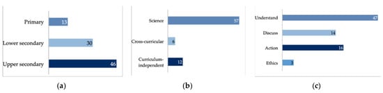 The majority of the climate education interventions took place at secondary school level (n = 46) with 30 at lower secondary schools. Thirteen studies took place at elementary school level (some studies incorporate students from multiple educational levels; see Figure 3a). Most of the interventions (n = 57) took place in science classes with only six interventions taking place in cross-curricular settings. Twelve were curriculum-independent or whole school approaches (see Figure 3b). A focus on understanding was the most common learning goal (n = 47), followed by discussing adaptation and mitigation strategies (n = 14) and the promotion of actions on mitigating and adapting to climate change (n = 16). The discussion of moral or ethical aspects of climate change is a central goal in three of the analyzed interventions (see Figure 3c).