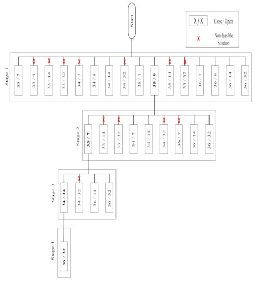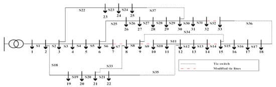 The flowchart of the switching sequence technique is demonstrated in Figure 1. To analyze the complexity of the search space, let us consider the example of the switching step in the small distribution network (33-bus network). The switches changed from the initial configuration (S33, S34, S35, and S36) to the final configuration (S7, S9, S14, and S32) in the distribution network, as shown in Figure 2. It can be observed from Figure 2 that one of the switches from (S33, S34, S35, and S36) is closed first, and in the consecutive stage, one of the switches is open from (S7, S9, S14, and S32) or vice versa. Therefore, the total possible switching sequence for a 33-bus distribution network is 1152. However, the complexity of the search space increases immensely with the increase in tie lines in the extensive distribution system. Moreover, there is a considerable number of possible combinations which is non-radial (non-feasible). Therefore, it is imperative to apply optimization techniques to attain the optimal switching sequence of the network.