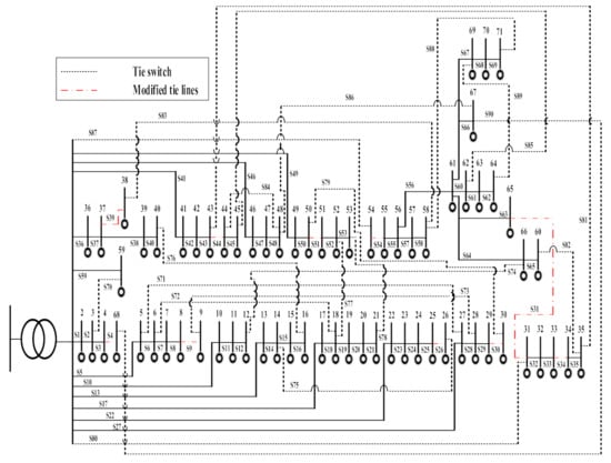 In the same manner, as the 33-bus system, Figure 3 demonstrates the topological structure for a practical 71-bus system, and the line and bus data are given in Appendix A, Table A1 and Table A2. One of the switches from these tie switches (S70 till S90) is closed first. Then, in the consecutive stage, one of the switches is open from the set of these modified switches (S4, S9, S26, S30, S31, S34, S39, S44, S51, S54) or vice versa. Consequently, the total possible switching sequence for a practical 71-bus system is 3.24 × 1024.